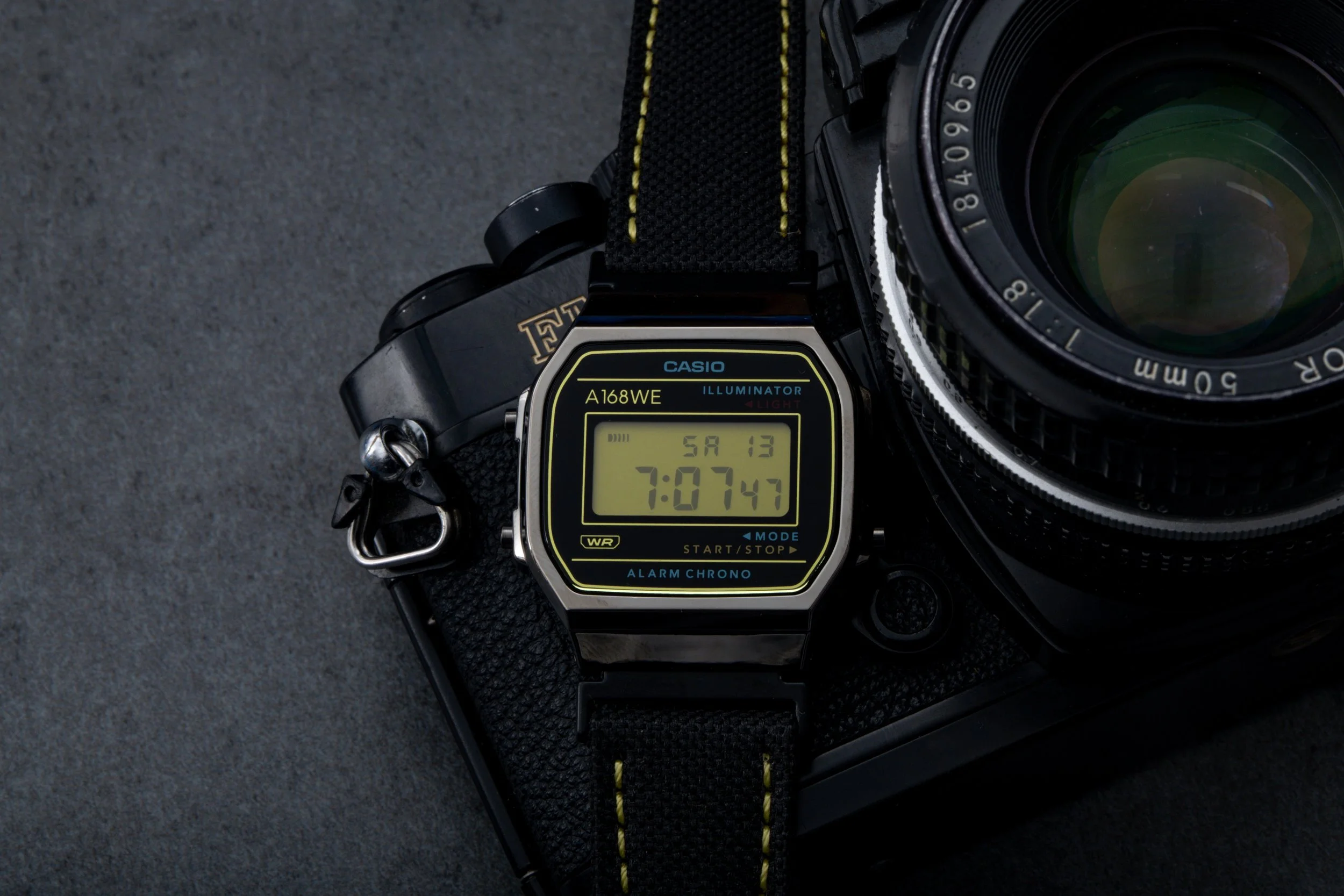 Completing the look is a canvas watch strap with yellow stitching accents, inspired by the iconic camera straps supplied with Nikon cameras.